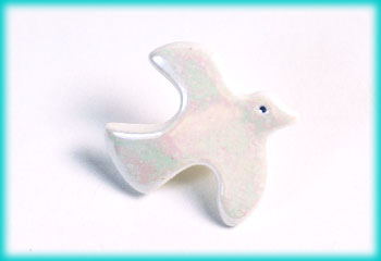 DP-1 Dove Pin Porcelain with irridescent finish. Tie tack back. 3/4 " Diam. Comes on a card that reads, "Let there be peace on earth and let it begin with me." $9.00